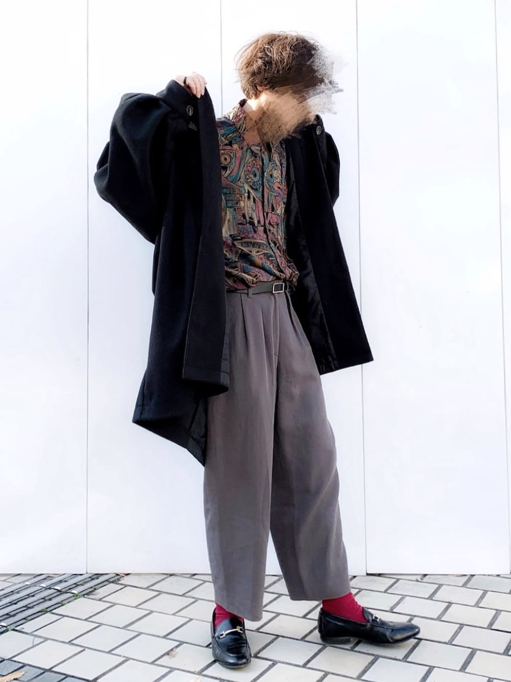 インスタ📲ryo_nunouch_719 柄シャツ絡めた 冬のキレイ古着コーデ💁♂️ 赤のソックスで 足元にアクセント🔴 防寒よりもお洒落重視🙌w