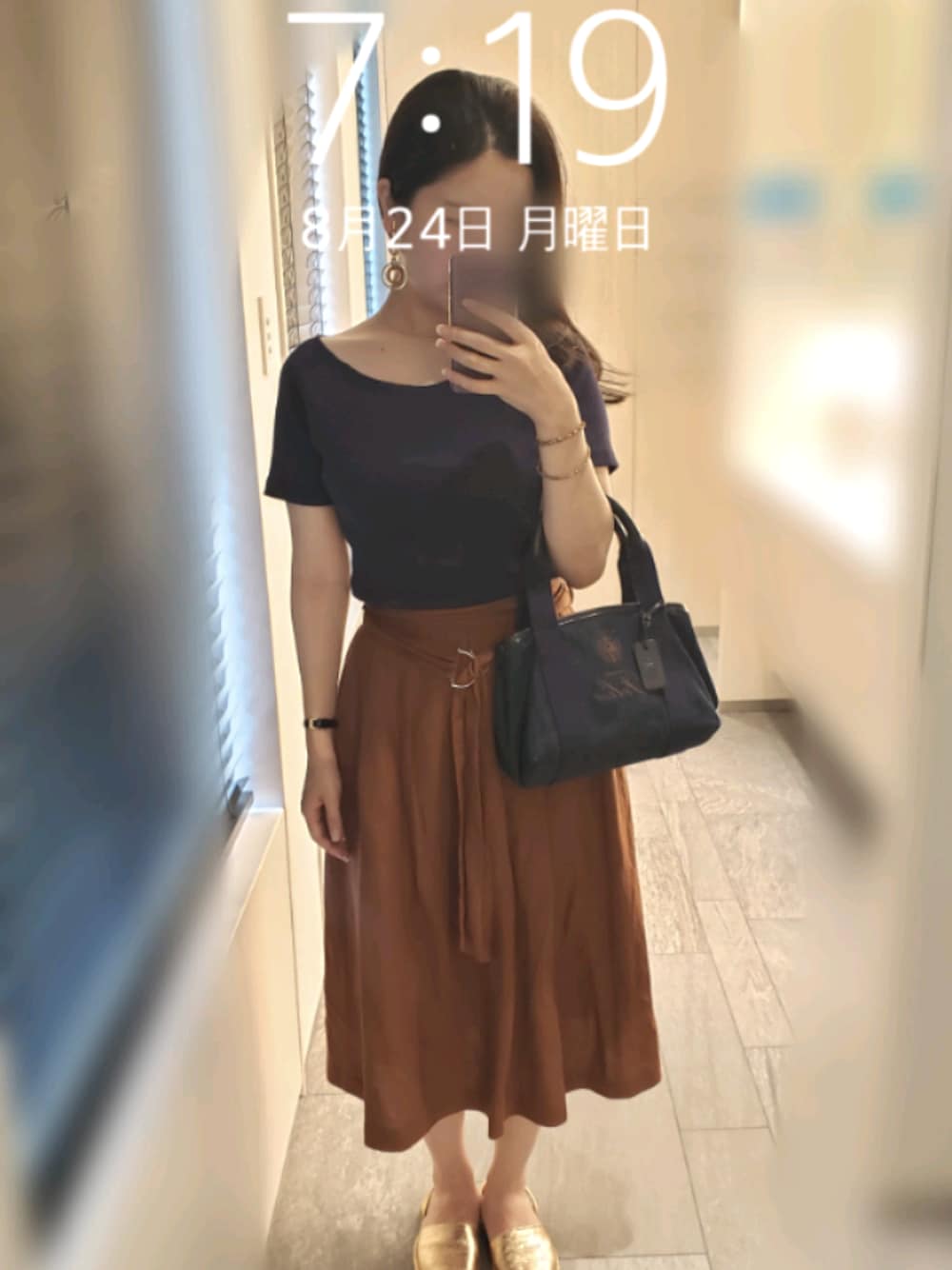 ちょっと涼しくなってきた?!から、ネイビー×ブラウンの秋カラーに🌰 お盆過ぎたら秋服。という崇拝する進藤やす子先生の言葉を勝手に心に刻んでる😂 フェリージの鞄はデニム生地👖
