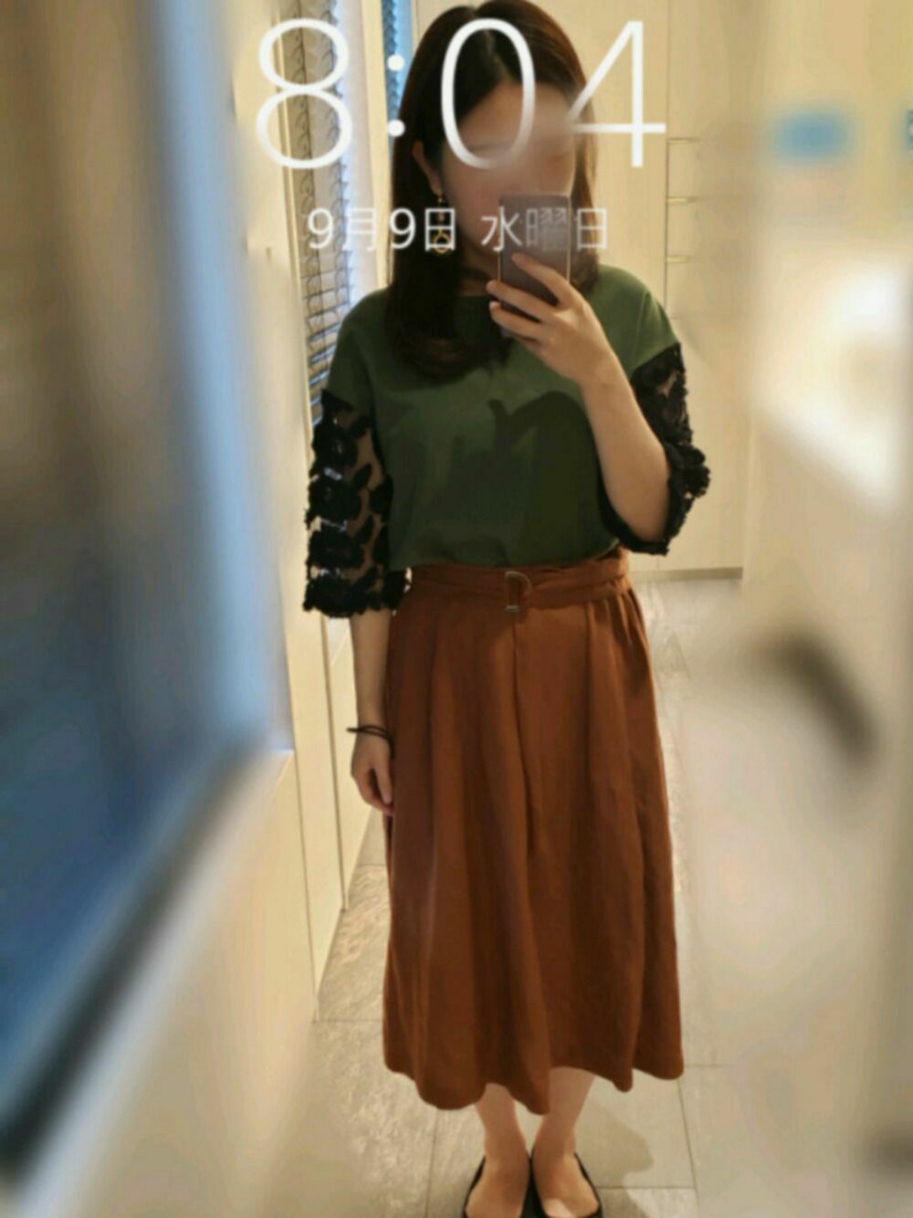 上は緑色、下は茶色… まさに木😆🌲!!! トップスは裏毛だけど、袖がチュール素材でカジュアルになり過ぎない🙆