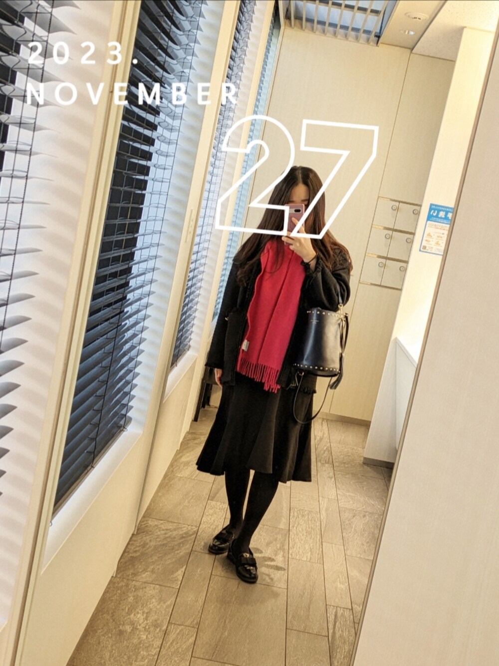 11/27(月)☆ ピンクマフラー🩷がポイントだけど 会社だと真っ黒すぎて😅
