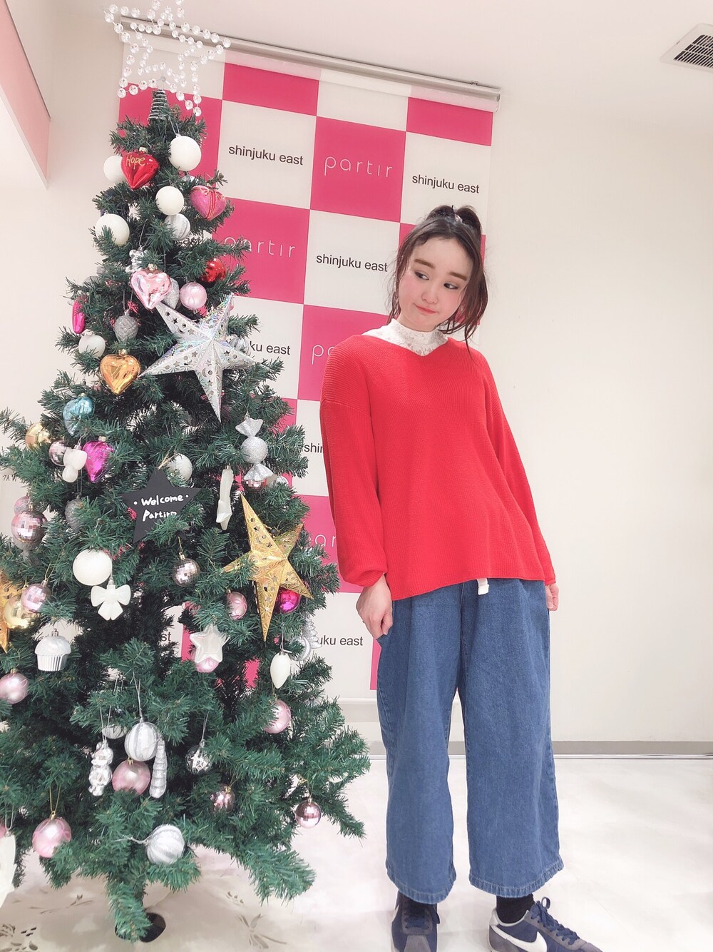 赤ニットのレイヤードスタイル🎄🎅 ゆる×ゆるのボーイッシュな合わせにレーストップスをINしたら少し女性らしさ出てイイかも( ⸝⸝•ᴗ•⸝⸝ )੭♡ クリスマスの時期だから赤ニットばっかり着てる🎄⛄🎁