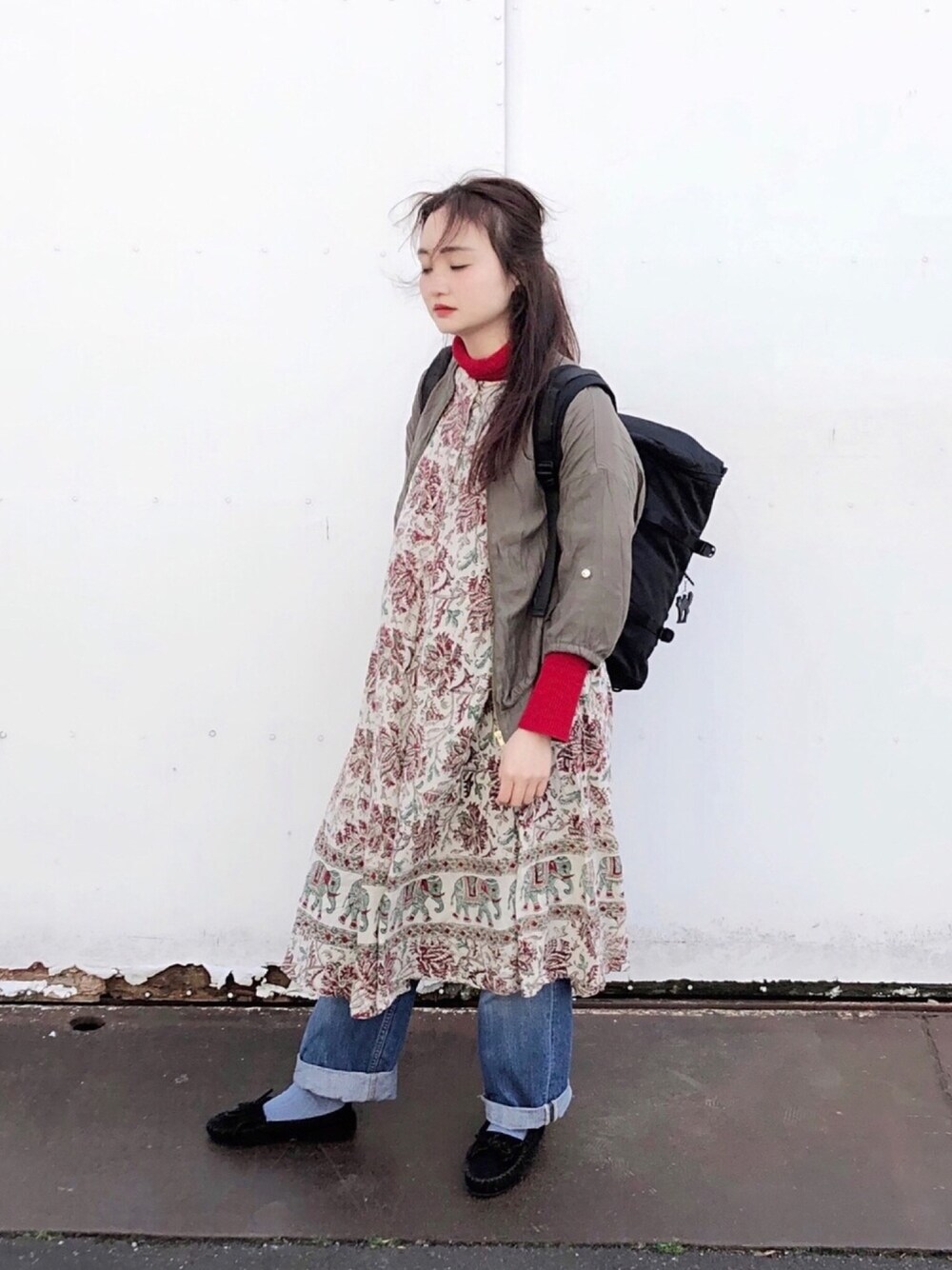 古着Mixスタイル❁.*・゚ 絨毯みたいな柄のワンピースの中に赤のタートルを着て、重ね着を楽しんでみました⌄̈⃝⤴︎︎︎⤴︎︎ いくつになっても古着スタイルが大好きだ⸜❤︎⸝ リュックぱんぱんw