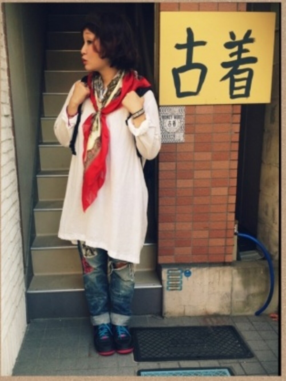 去年の夏 シャツワンピ 古着KINJI ¥900 長かったけど短くした リペアデニム 古着のRNA スカーフ 下北の古着屋 ¥200 ちなみにチャイハネのゴツい指輪でスカーフとめてます。