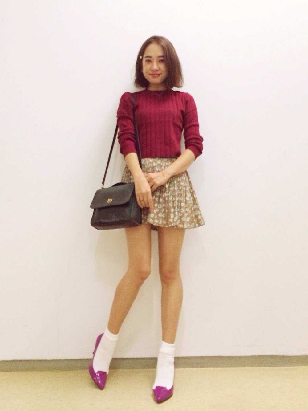 赤いニット、 キャメルのスカート、 ピンクのお靴❤️💓❤️💓