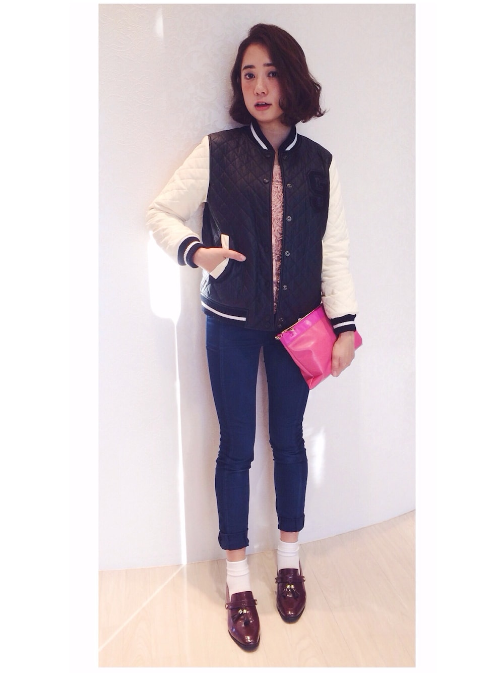 メンズライクなスタジャンには、ピンクのトップスとバッグを💖 やっぱり白靴下がすき