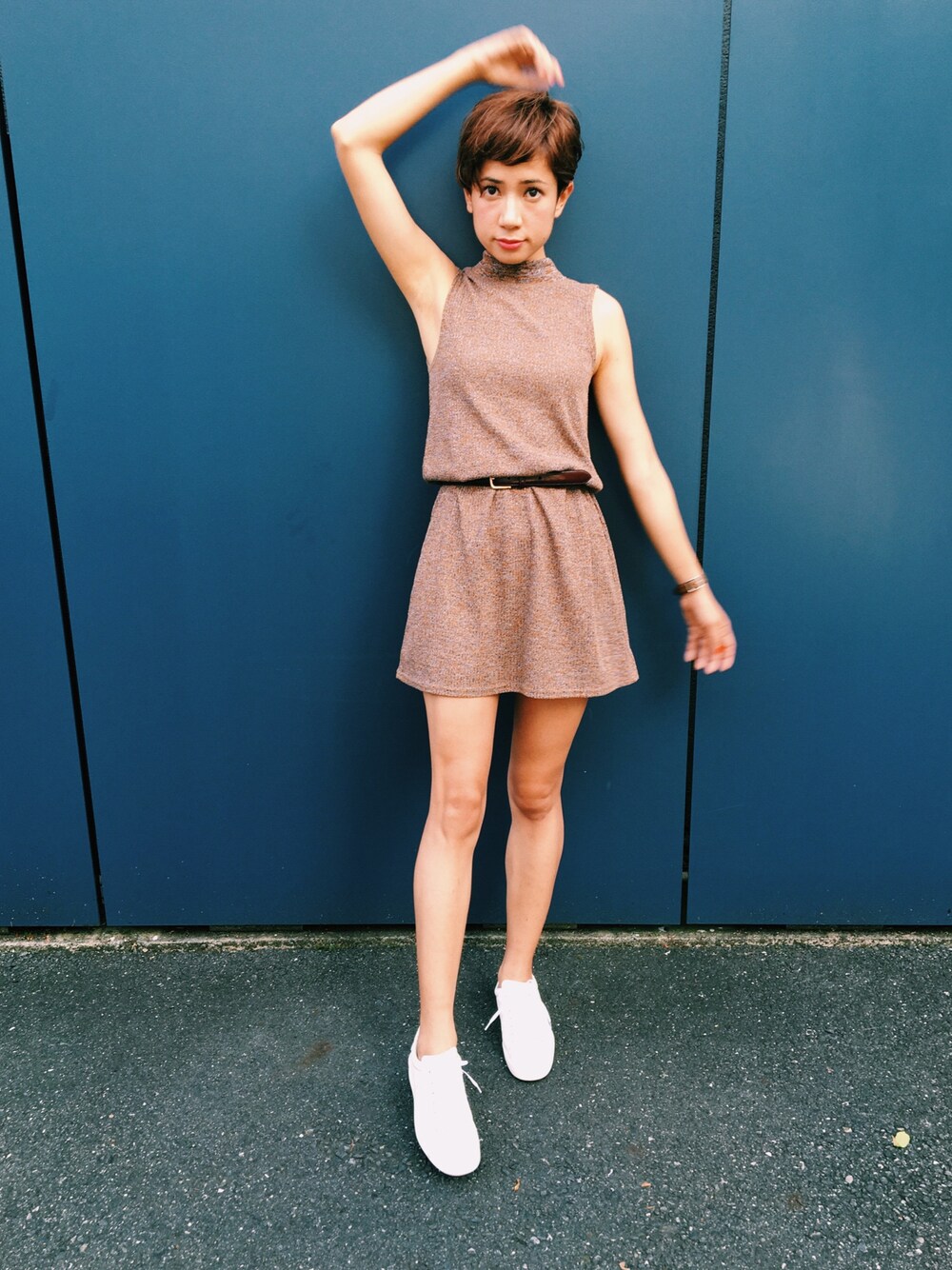ブラウン系のワンピース、ホワイト系のスニーカーを着用したレディースの夏コーディネートの1枚目の写真