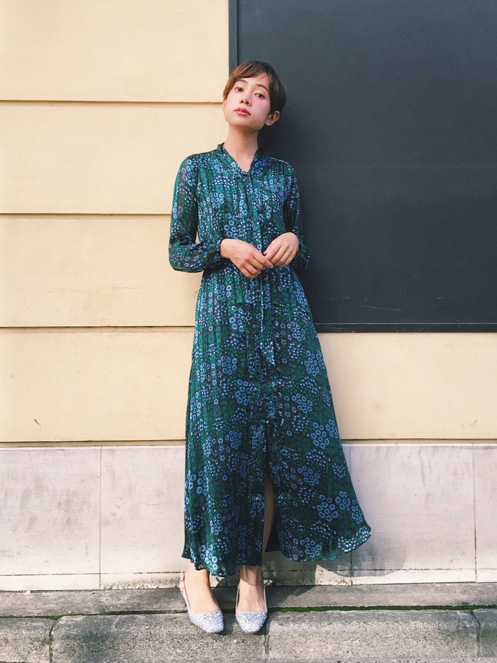 グリーンとパープルの花柄も、 ヒラっと揺れる裾も、 首元のタイも、 キラキラの足元も、 わたしもハッピーにしてくれる🌼