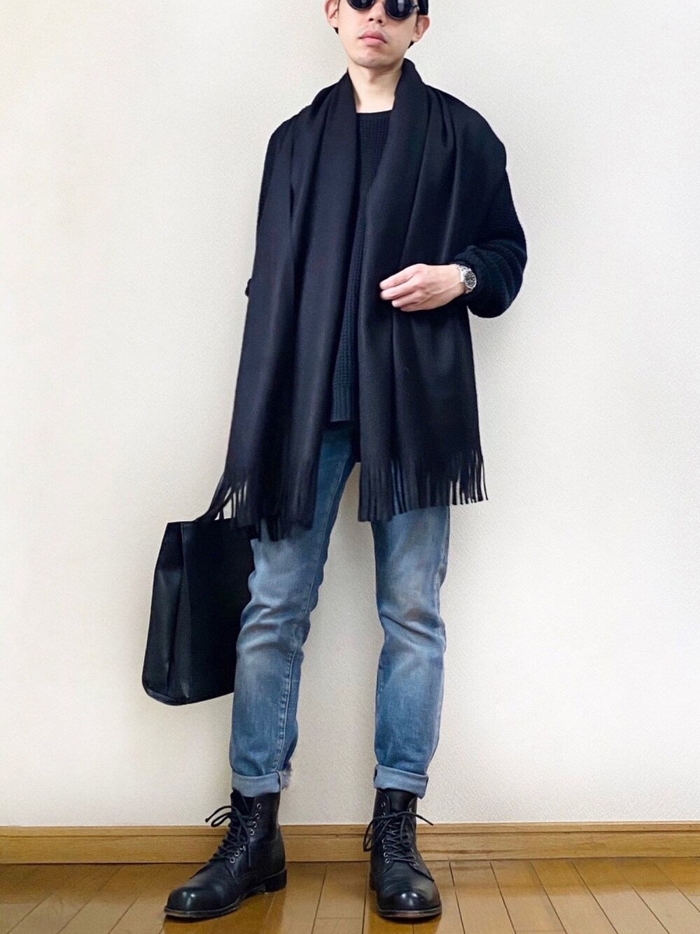 ★ストールをラフに羽織ったシンプルコーデ★ -着こなしのポイント- 艶感とドレープ感のある大判ストールは男らしくラフに羽織る。シンプルイズベスト。