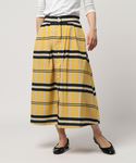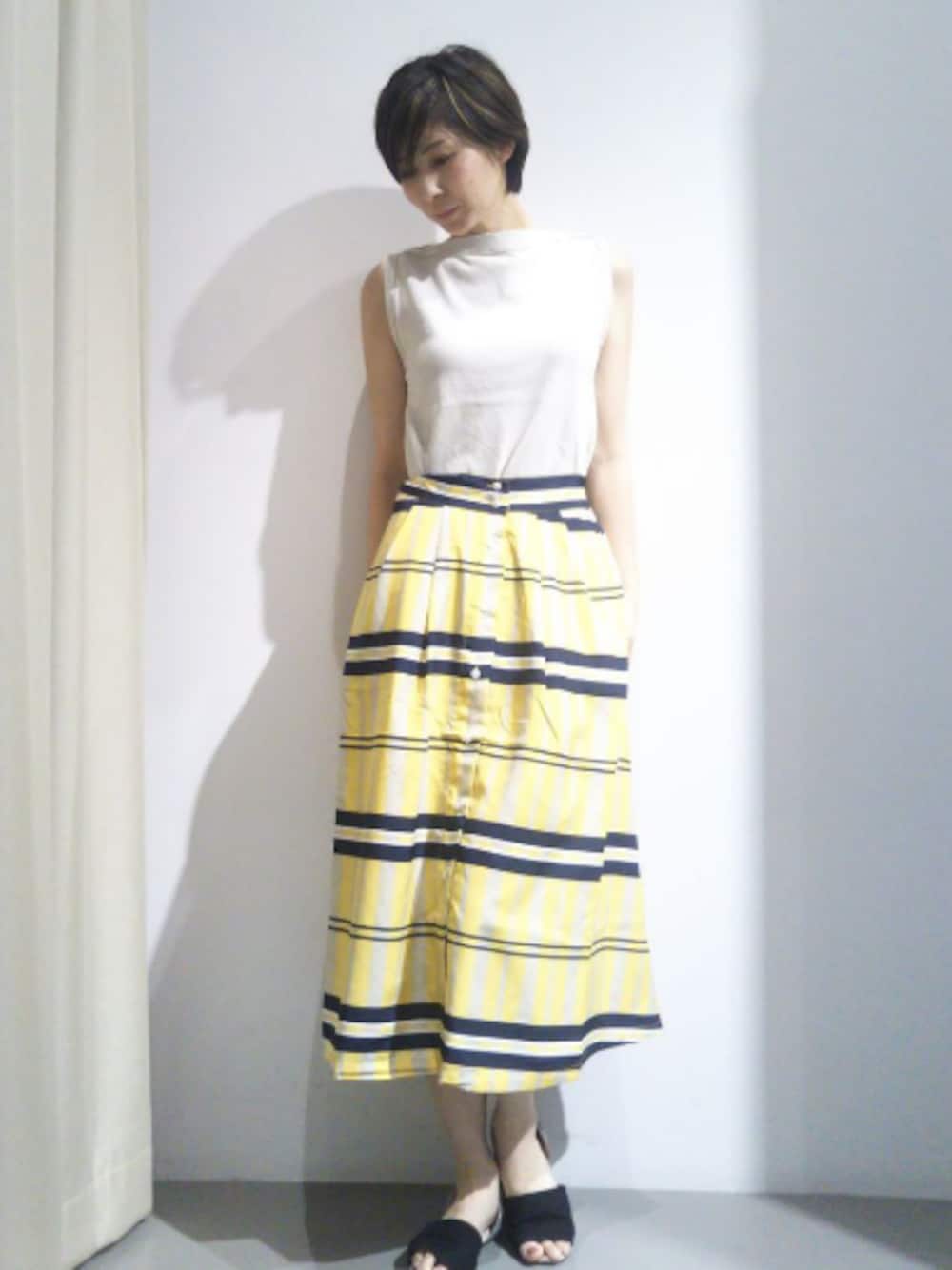 レトロなパネルボーダーとフロントボタンが◎なスカート✨ ひとめぼれの1品です♥ 1枚でとっても上品な着こなしに(о´∀`о) アイボリーのボートネックトップスを合わせていますが、白T合わせだとよりカジュアルに、ネイビーのブラウスなどと合わせるとよりキレイな感じになりますよ♥