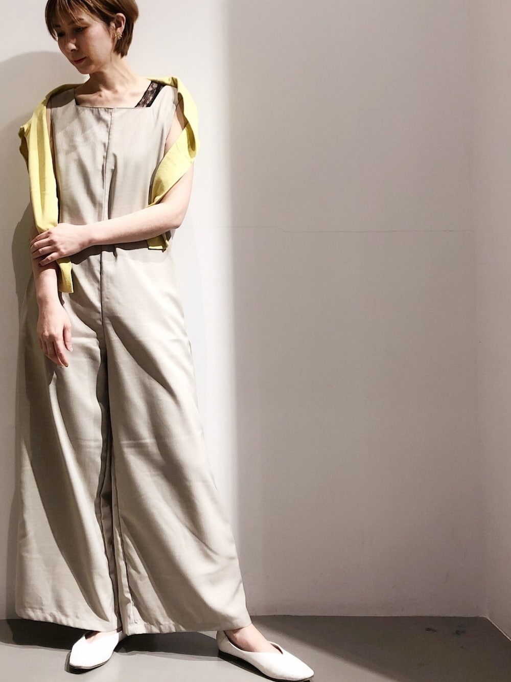 晴れてる日はすごく暖かく感じることも☀️ スクエアネックのサロペは今からだとキャミソール合わせでも◎ イエローのカーディガンを挿し色に🌻