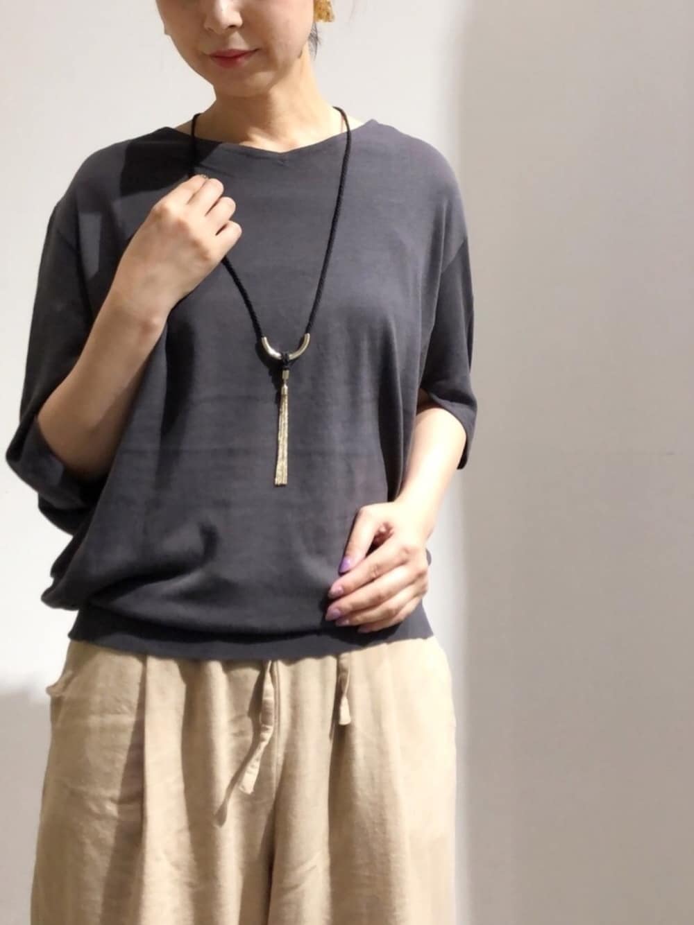 Fukusunのニット/セーター「ドルマン変形5分袖ニットプルオーバー 〇*」を使ったコーディネート