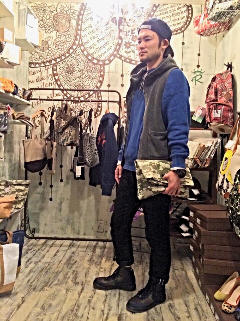今日は暖かい一日 カラーリングも徐々に春を意識して カモフラのクラッチバッグが印象をまとめてくれます