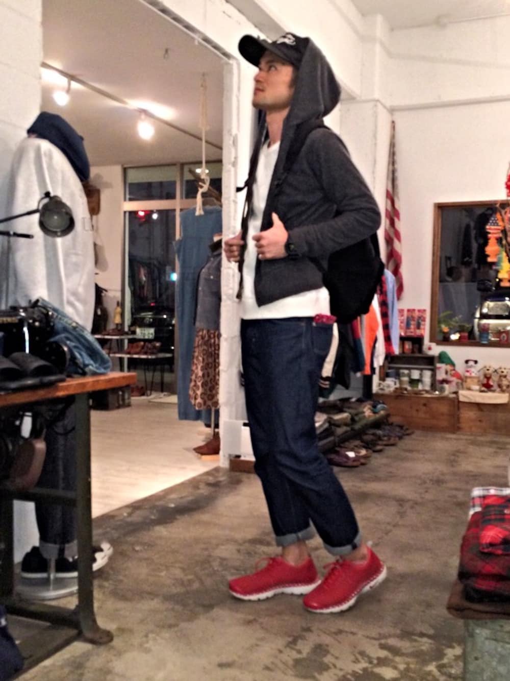 いつもご愛読ありがとうございます‼︎ 今日のテーマはパーカー。 フリース地のパーカーをキャップと合わせてスケータースタイルに仕上げました。 デニムはロールアップして赤のバンダナ、ナイキの赤のスポーツシューズで赤を際立たせました。 何でもないこんなスタイルが日常的で好きですね。