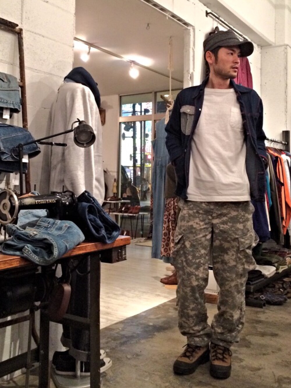 今日のテーマはミリタリー。 デジカモのパンツはカモフラが苦手な方にはお勧めのアイテムですね。 カモフラでも主張し過ぎず、でもコーディネートのアクセントになってくれる柄です。 ブーツもキャップもミリタリーにする事で男らしさが出せるのではないでしょうか? 要はミリタリーって男の闘争本能を掻き立てるアイテムなのかな。 あぁー筋トレしてぇ。