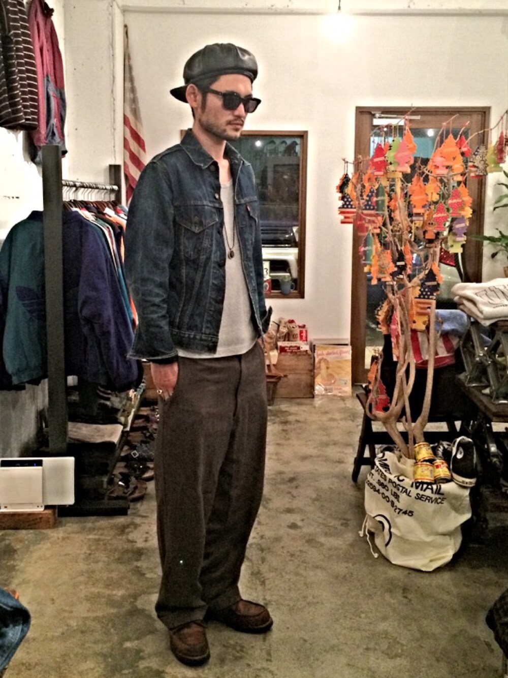 こんな天気のいい日にはGジャンが着たい気分。 Levi's70505はGジャンの中でも、最もファッション性が高いと言われる一品。 細身な自分には一番似合うボディが割とタイトな裁縫になってるんです。 フラップポケットの形や色落ちなど完璧でお気に入りの1着ですね♫ パンツも50'sのスラックスでワイドで無骨なシルエットが気に入ってます。 やっぱりアメカジって好きやなぁ♫