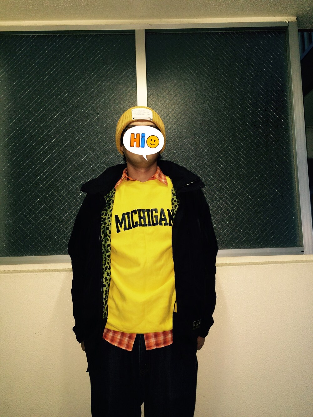 カレー好きそうな配色、帰りはココイチか? 真っ黄色のChampionのカレッジトレーナー、古着のオレンジのシャツ アウターが思い付かなくてMANASTASHのナイロンジャケットになってしまった😩 今日も今日とてもっさもっさだよ、もっさもさ!
