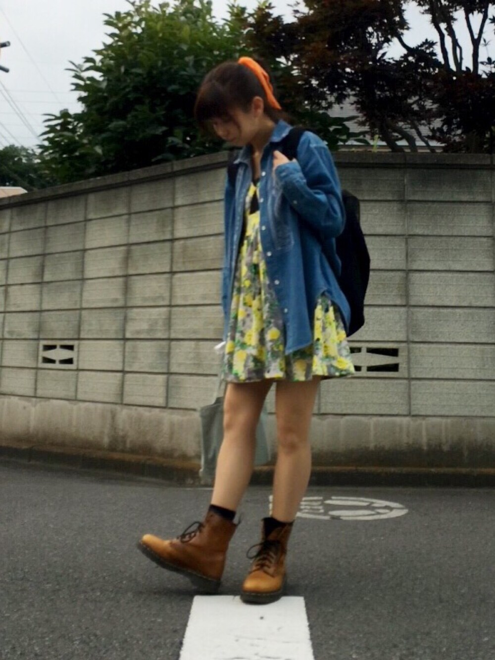 ポップカラー★ Dr.Martensのブーツは古着屋で購入したものです🙉✨ イングランド製のキャメル*\(^o^)/* デニムシャツは、お母さんが若い頃着ていたもの☺️ おしゃれって繰り返されるんですね