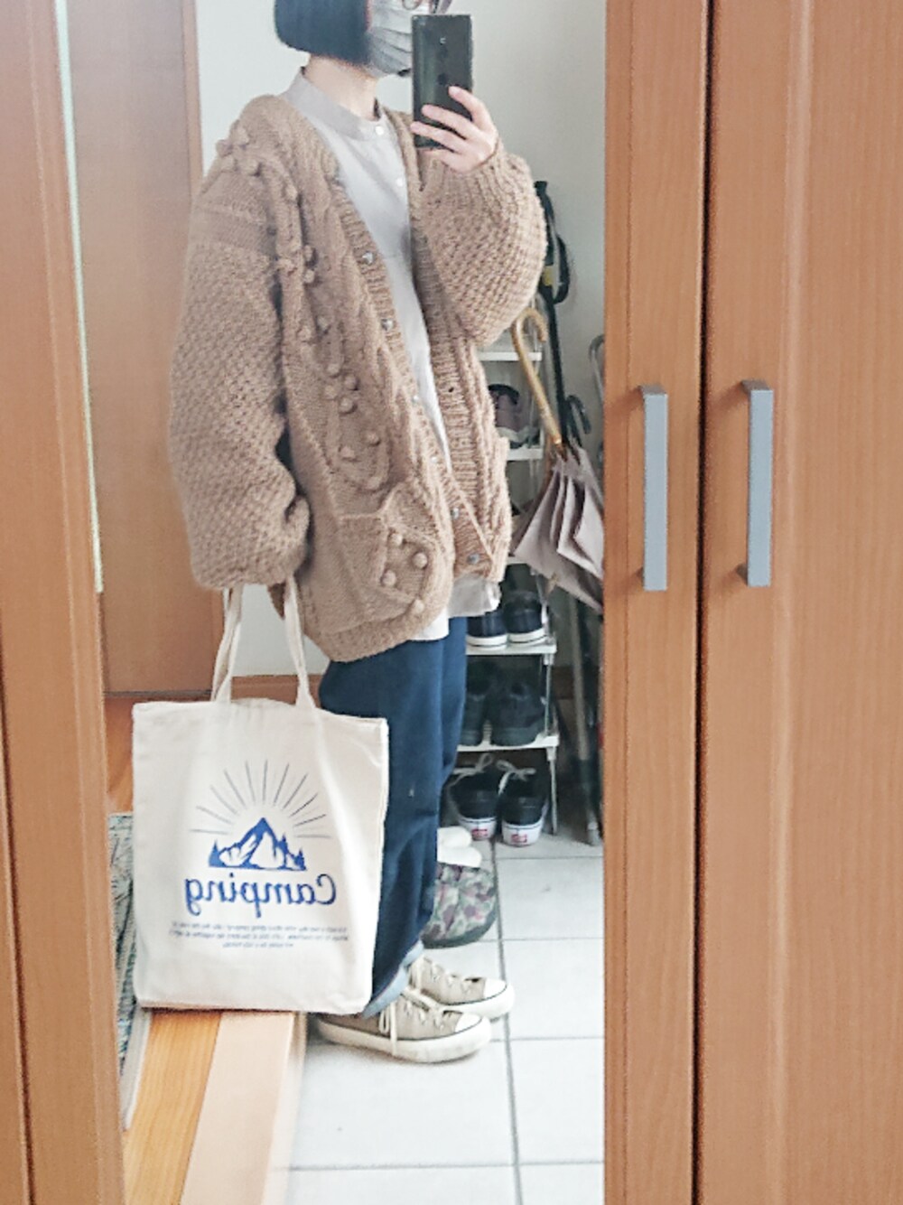 3月コーデ記録。 買い替え割に出したニットカーデ。 さよならニットカーデ。 エコバッグ…DAISO