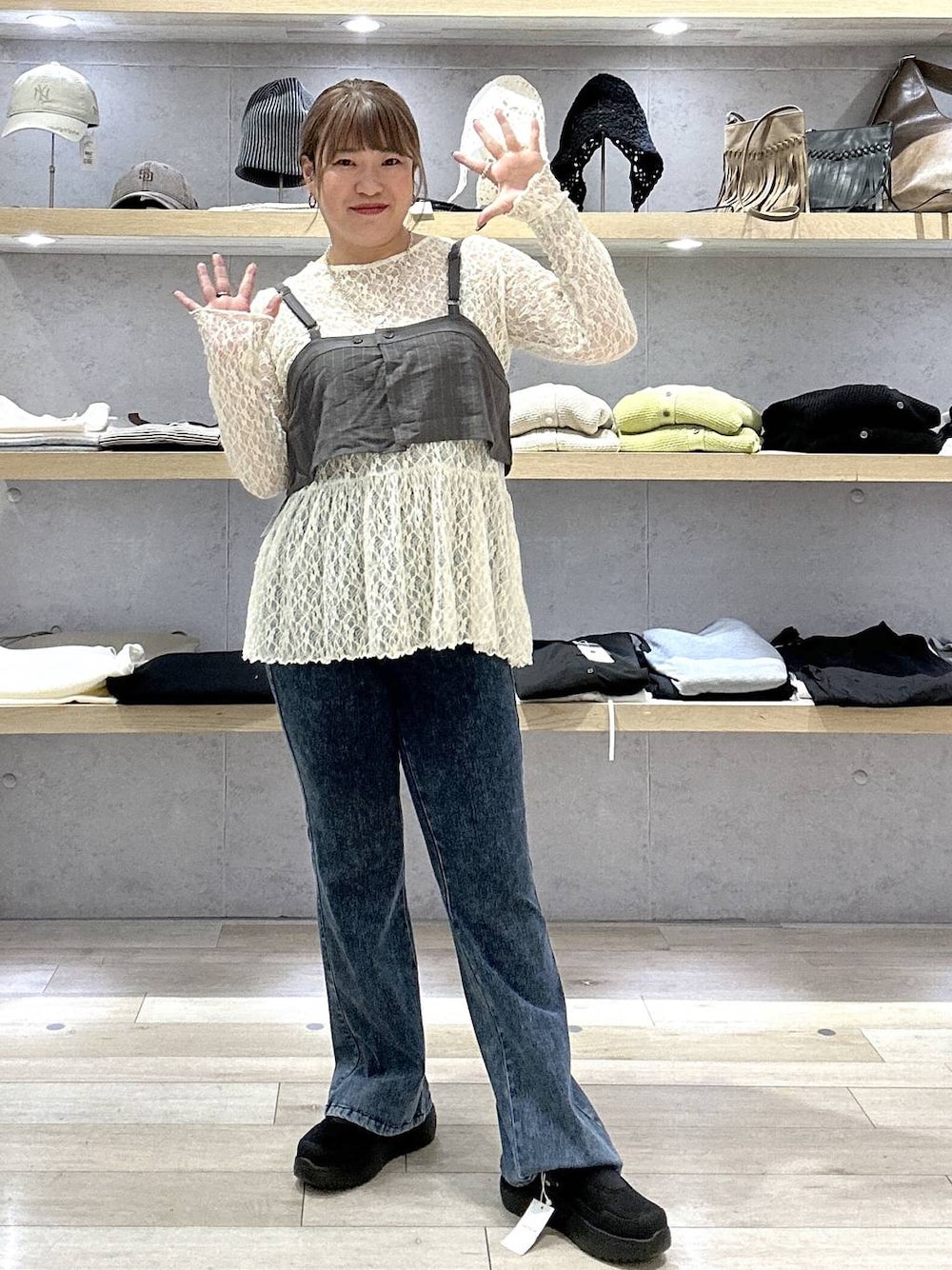 ばなおりです! 158センチ 44歳 ぽっちゃりです!! ーーーーーーーーーーーーーーーー ⭐︎総レース長袖ペプラム 今年人気のレースアイテム 伸びやかで、程よいフィット感! レイヤードアイテムとしても、一枚で使ってもいいアクセントになります♪ ⭐︎《オフィスライン》ビスチェ さらっとした生地のシンプルなビスチェ 後ろがボタンなので、調節可能!私でも苦しくなく使えました😊 ⭐︎よく伸びデニムパンツ ストレッチ素材のデニムパンツ とにかく伸びやかで楽ちん!!そして、美脚、細見えするパンツです!! ⭐︎2WAYスポーティサボ 軽くて足が疲れにくい厚底サボ メッシュ素材とフェイクレザー素材がドッキングされているので、一年中使えるアイテムです!! ⭐︎⭐︎Instagramも随時更新しています⭐︎⭐︎ こちらもぜひ遊びに来てくださいね🤗 ↓ ↓ ↓