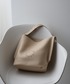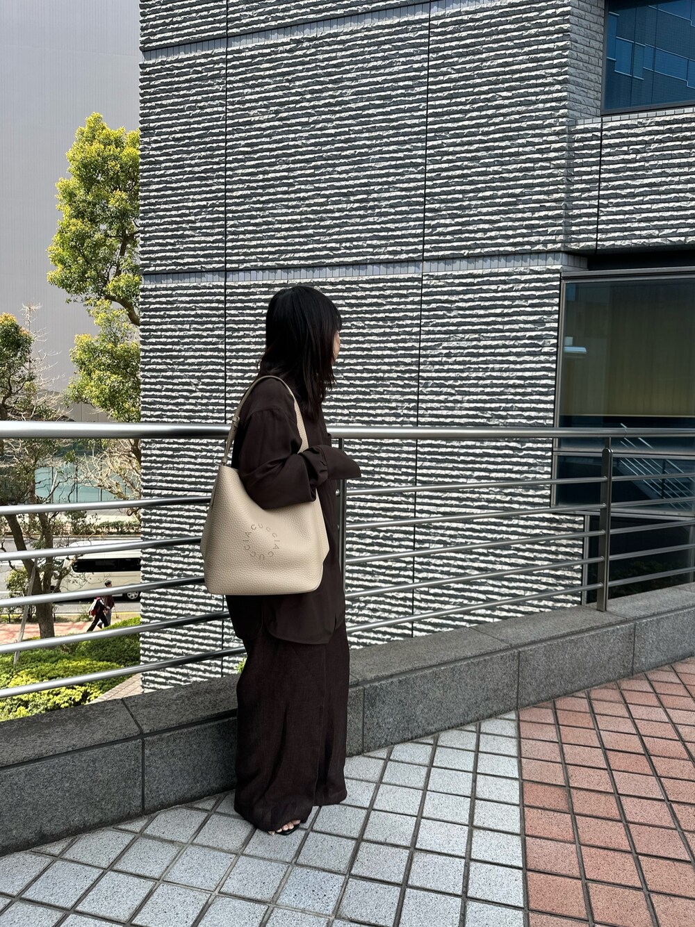 くったり柔らかいレザーのワンハンドルトートとブラウンのセットアップコーデ