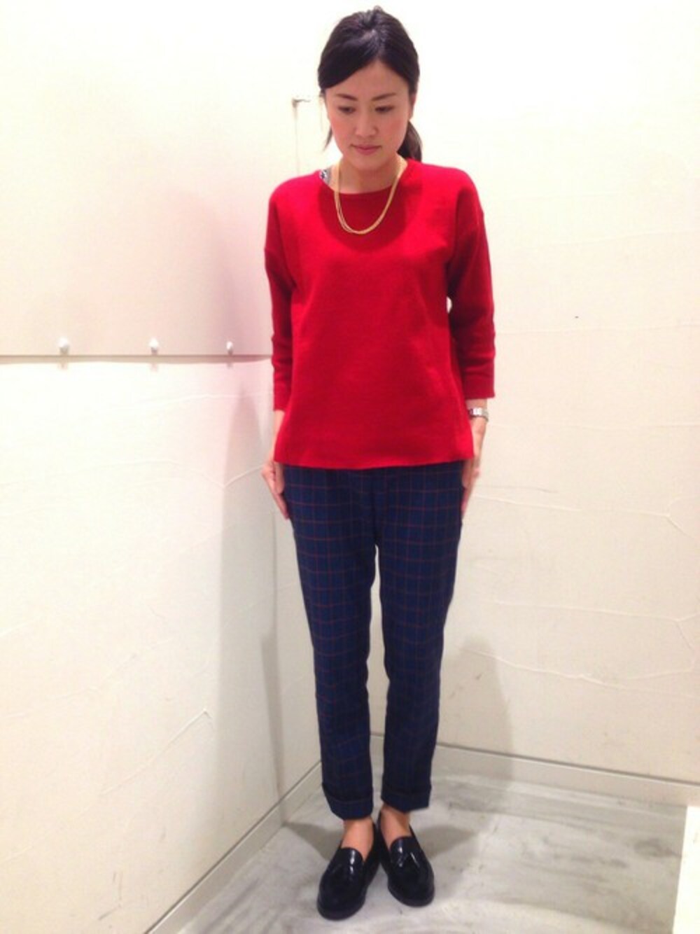 キーカラ-のレッドのニットにウインドペンパンツとローファーでマニッシュにコーディネート。 ローファーはHARUTAとのコラボです!!