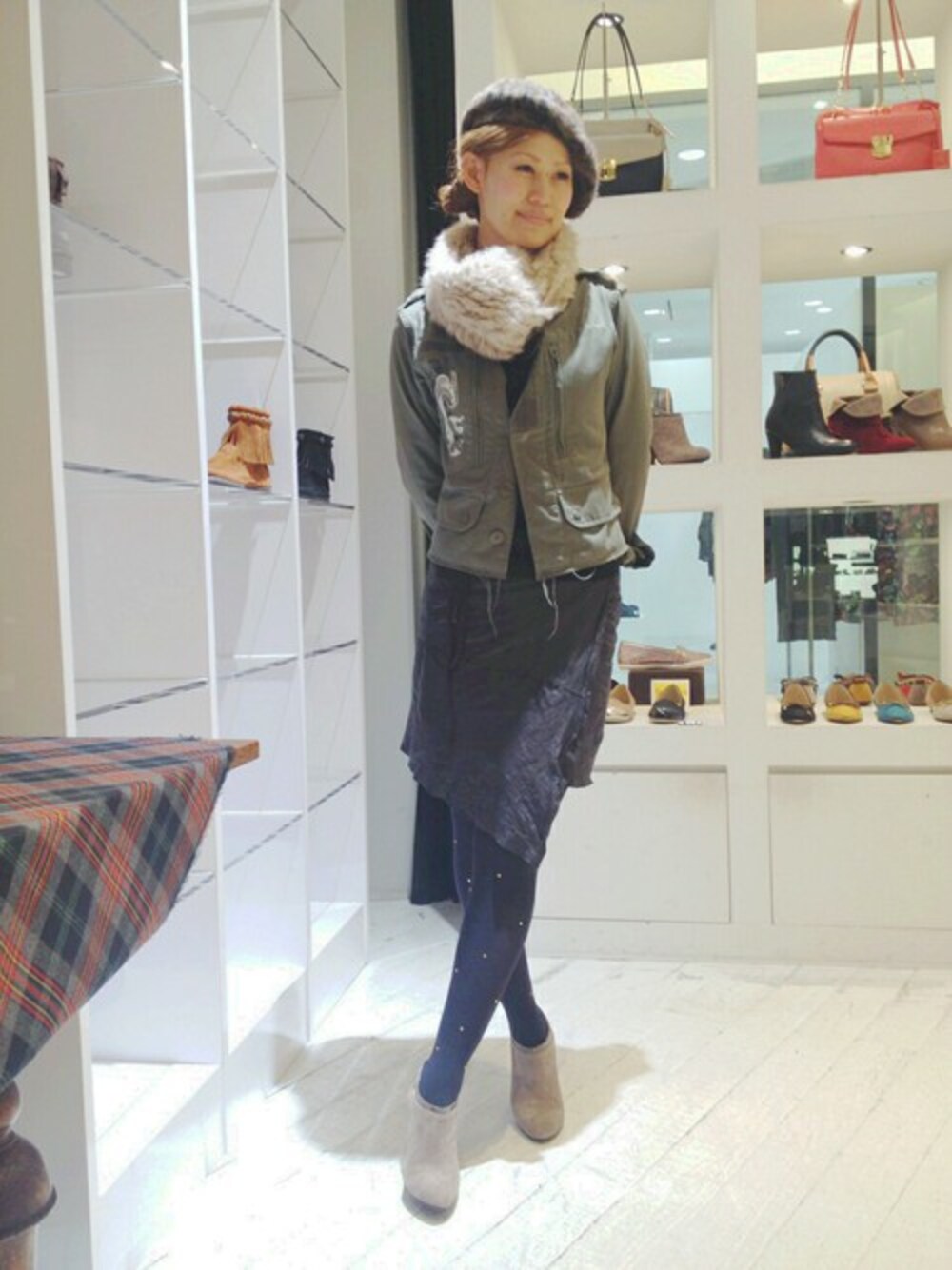 全体をアースカラーでまとめ、ブーティーとスヌードのカラーを合わせてバランスを取ったコーディネートにしてみました。