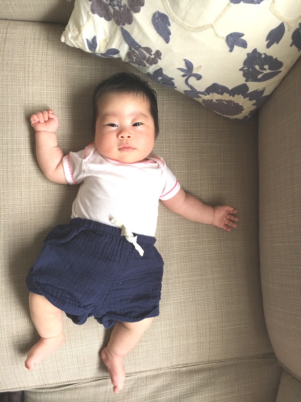 プチバトーの3枚セットのボディ肌着はデイリーに着用。 今日も着替えて着替えて3枚目。 そのままでもかわいいのでちょっとパンツ履いて出かけちゃいます。