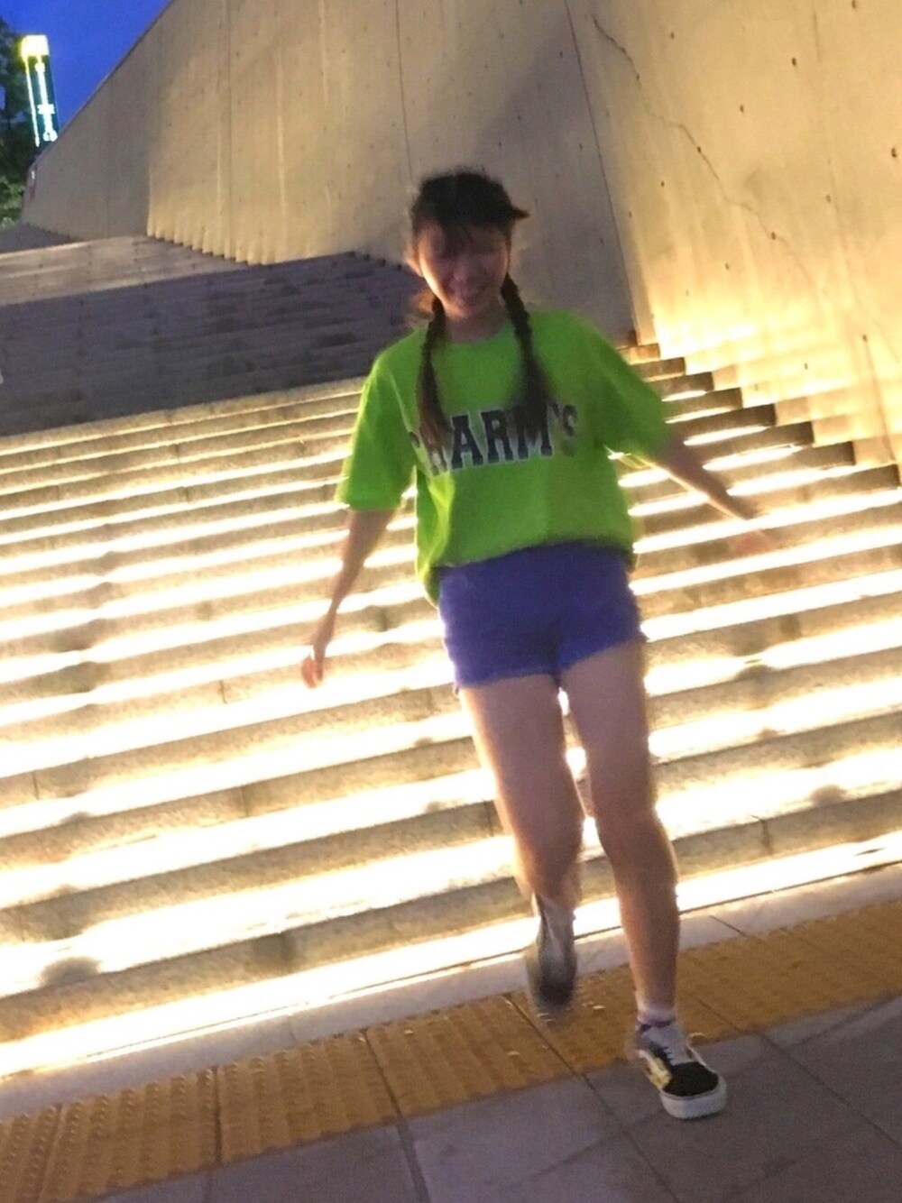パープル系のパンツ、グリーン系のTシャツ/カットソー、レッド系のスニーカーを着用したレディースの夏コーディネートの1枚目の写真