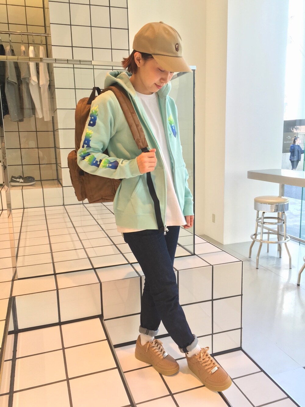 パステルブルーの色が綺麗なパーカーが引き立つように、小物の色を統一してコーディネートを組みました!!
