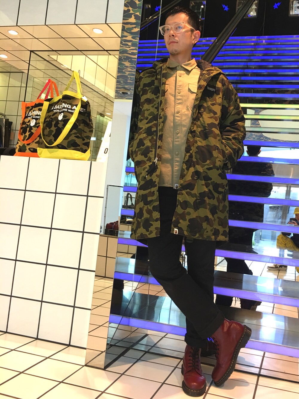 待望のBAPE®︎×Dr,Martinの8ホールブーツにミリタリーテイストのアイテムを合わせ、全体に統一感を出しました。