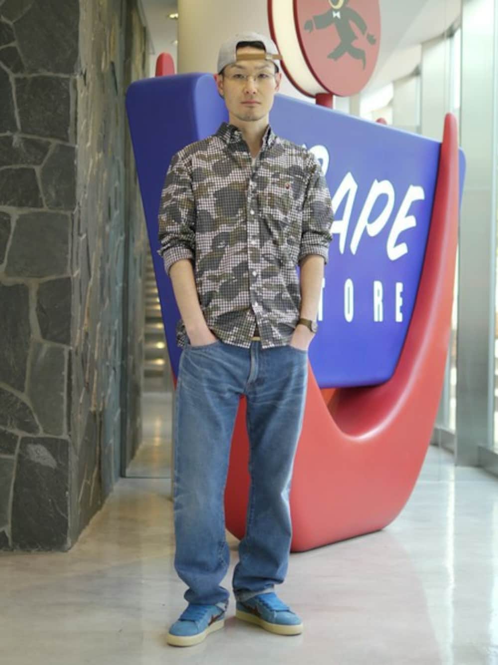 オリジナルネームのレザーパッチ、ピスネームなど細かなディティールにこだわったインディゴラインのデニムパンツ。カジュアルになり過ぎないシルエット、加工具合も特徴的。合わせるのは春らしいギンガムチェックに1ST CAMOがプリントされたBDシャツ。足元は綺麗な色のスウェード素材のCRAPE STAで!