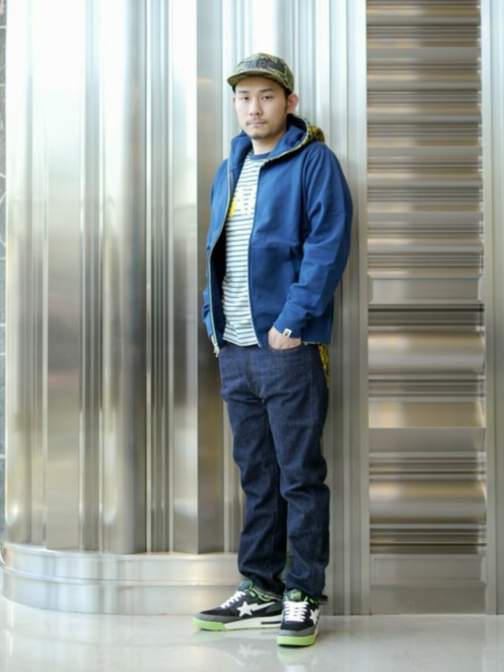 ROPE CAMOモチーフのジップフーディ。インナーにはポップな配色のボーダーTシャツ、ネオンカラーが効いたスニーカーでよりカジュアルにコーディネート。