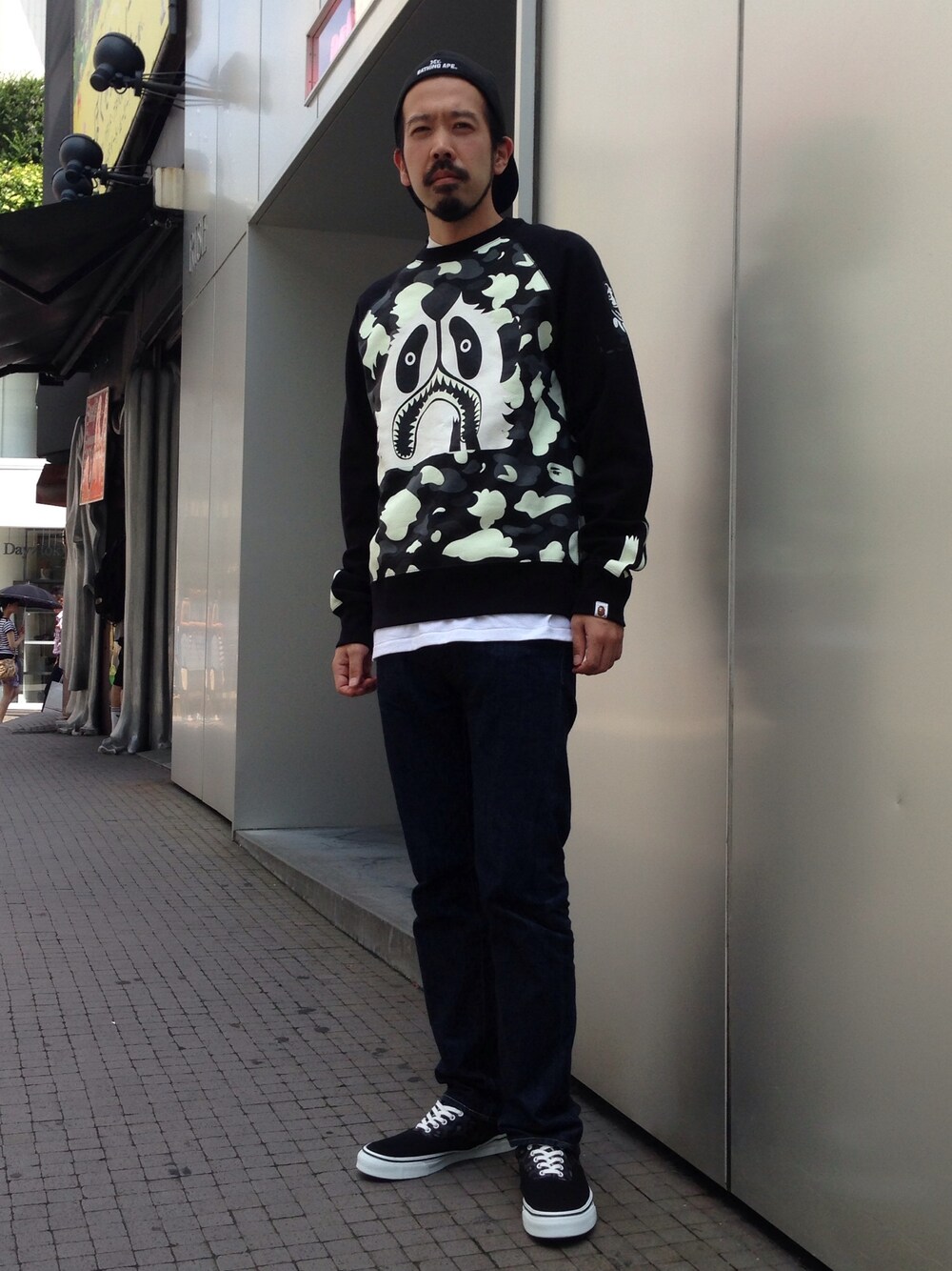ZOZOTOWNリミテッドのパンダクルーネックスウェットです。BAPECAMOが蓄光素材となり、人気のパターンですね。 スウェットとインナーのTシャツを大きめで着て、存在感を出してみました。 パンダクルーネックスウェットはZOZOTOWNリミテッドになります。