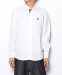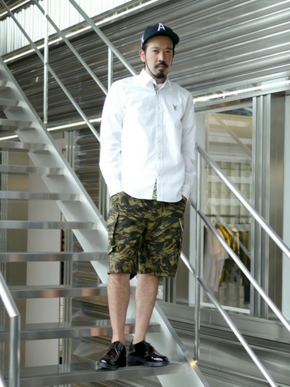 A BATHING APE® × PLAYBOYによるワンポイントが特徴的なベーシックなホワイトシャツ。ボトムには今シーズンのLIZARD CAMO柄アーミーショーツ、足元はガラスレザーのシューズやシンプルなものをチョイス。