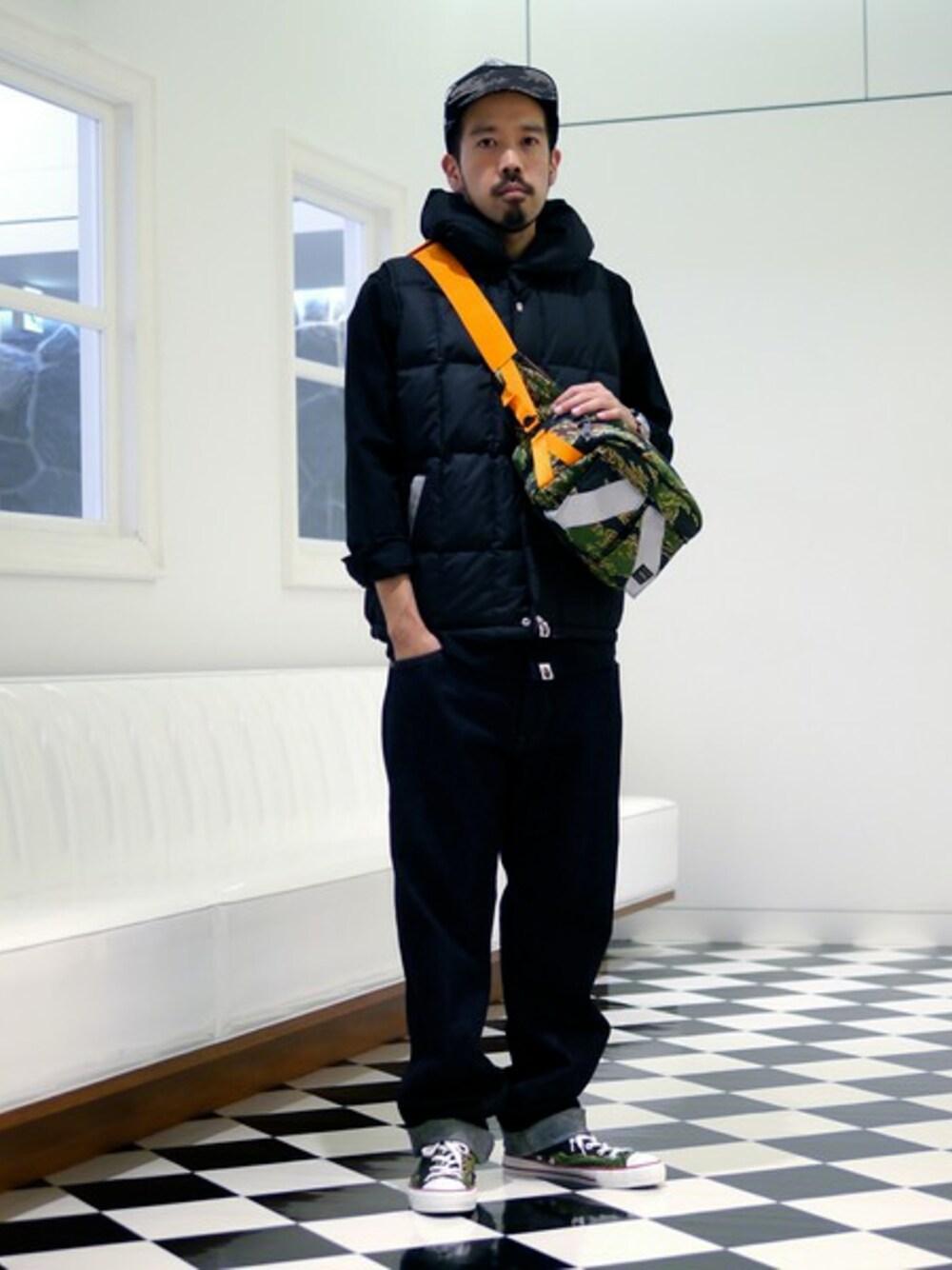 襟元が特徴的なダウンベストを中心に、同色のシャツ、濃い色のデニムパンツでシックなカジュアルにコーディネート。アクセントにはオレンジのテーピング、フロントのリフレクトが効いたBAPE TIGER柄のウエストポーチ。