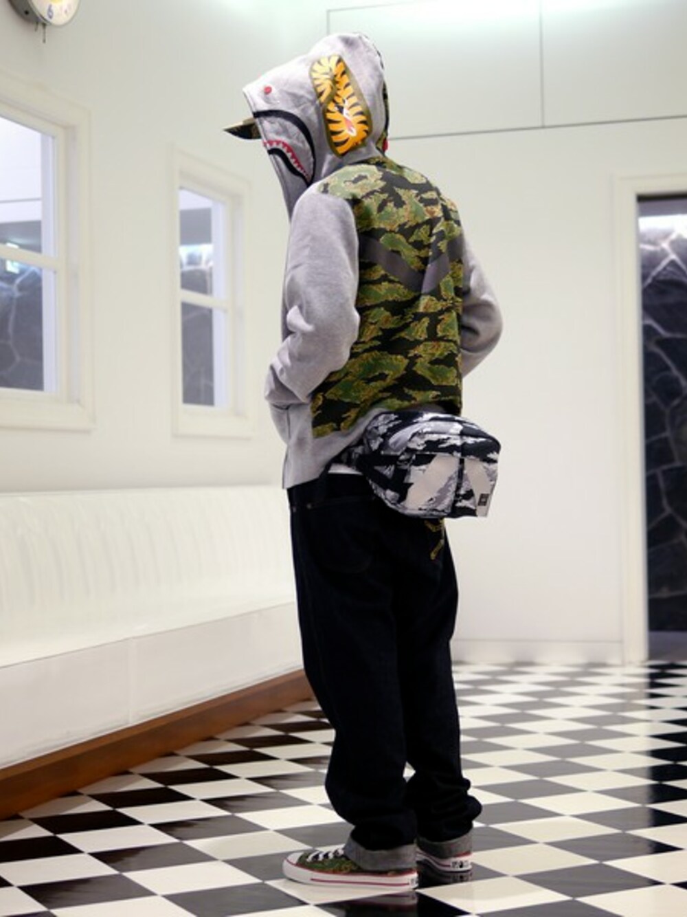 BAPE TIGER柄で仕上げたリフレクターアイテム中心にコーディネート。キャップ、フーディ、ウエストポーチ、スニーカーのリフレクトがとにかく夜の散歩やナイトクラビングを楽しくしてくれる。