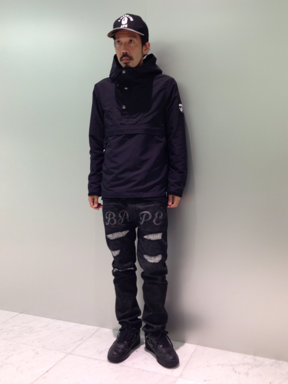 今の季節に最適のプルオーバーライトジャケットを中心に全体を黒でまとめました。