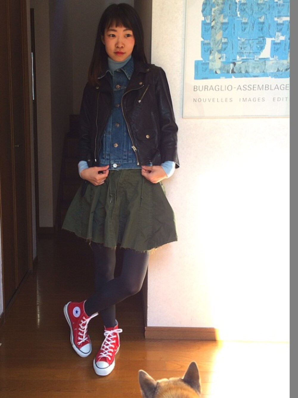 やってみたかった!!! デニム×レザーライダース のレイヤード!!! beautifulpeopleのライダース。 私はサイズ130ですが、 かなりスッキリしているのに ニットもガンガン着れちゃう!! 肩がストレッチのように伸びる作りになっていて、たくさん着込めるところが素敵です♡ 午前中はずっと卒論やってたので お昼に息抜きでアップしました(笑) 写真を撮っている時 飼っている犬(まぐ)が入ってきました(笑)