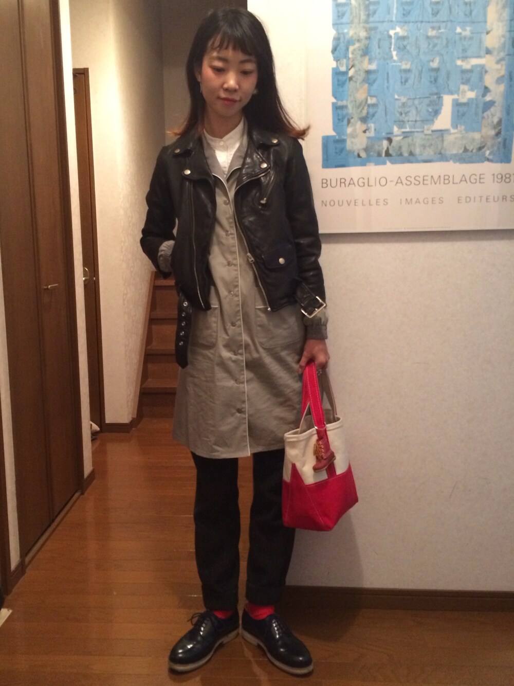 今日も一日お疲れ様でした〜! 今日は、ノーカラーシャツに パジャマシャツワンピースに ライダースをレイヤードさせてみました☻