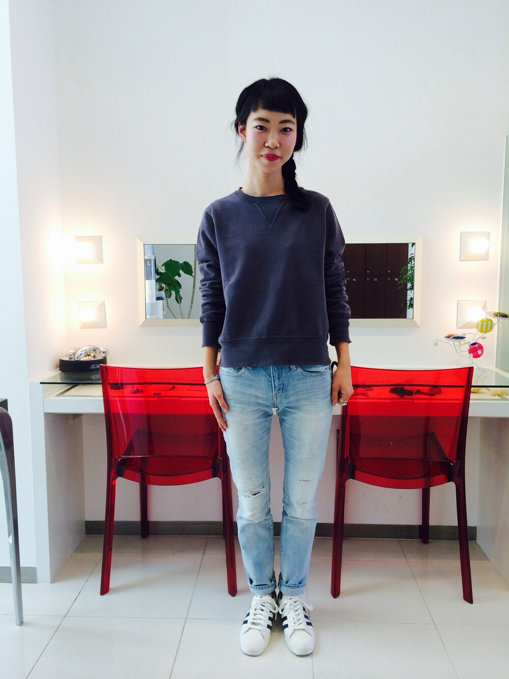 美容院いってきました!!! 石田さんありがとうございます♡ ヘアアレンジがんばります! レミのスウェットに ダメージデニム! アウターはレザー合わせてます♡ ノームコア!! すきです。
