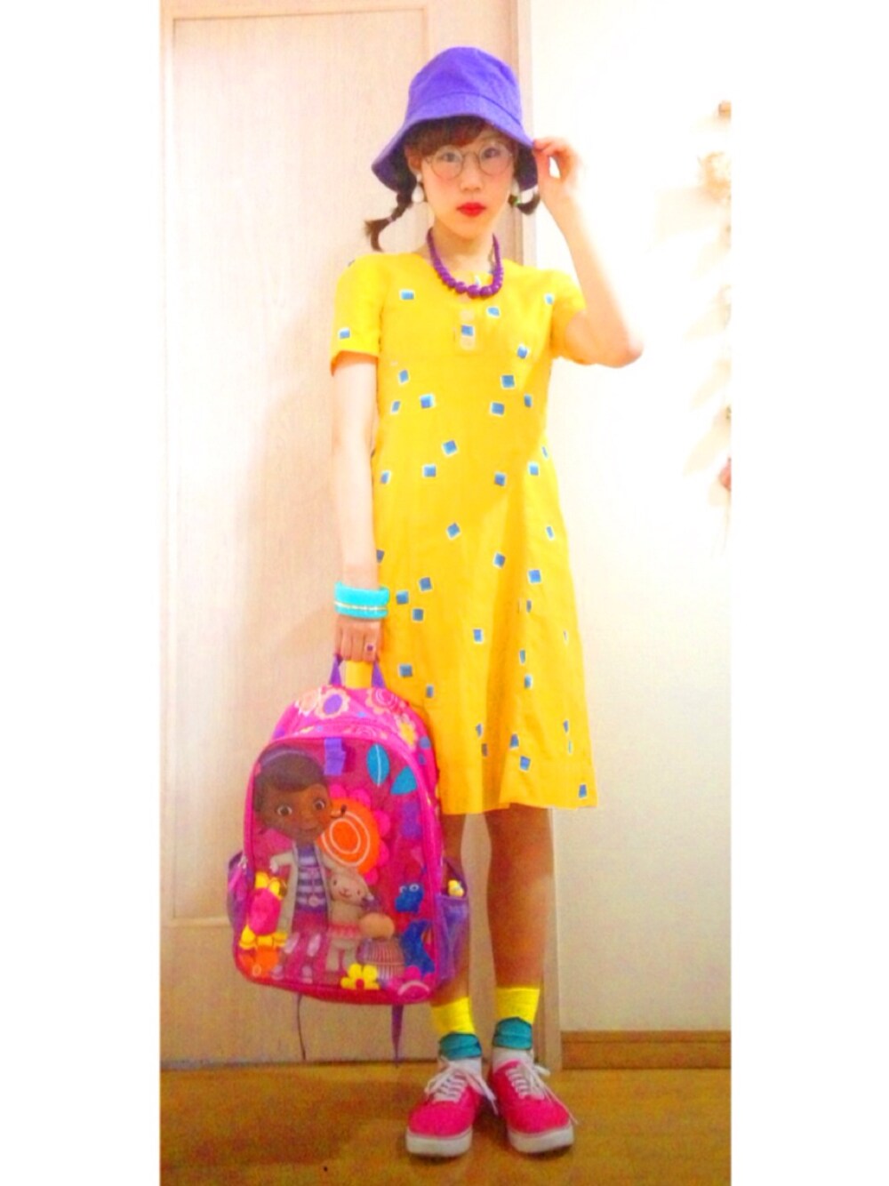 帽子.古着屋さん.1000円.メンズ用 手作りワンピース.古着屋さん.1200円 靴下.WEGO.300円位 ネックレス.お母さんからのおさがり 丸めがね.原宿のメガネ屋さん.1050円 イヤリング.クレアーズ.500円位 ブレスレット.500円 リュックはドックはおもちゃドクターで横ポケットにはPEZや、ペンを入れてます💗💜🙌