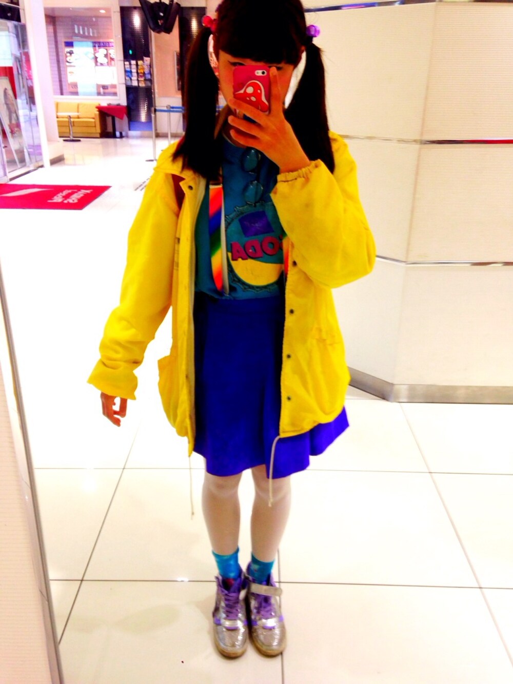 トレーナー.古着屋で購入 ナイロンジャケット.古着屋で購入 lecoqsportifのスカート.古着屋で購入 白タイツと靴下.tutuanna 靴.H&Mのkids 昨日の格好です💗💜 トレーナー、靴下はこないだと同じですが😁🌈