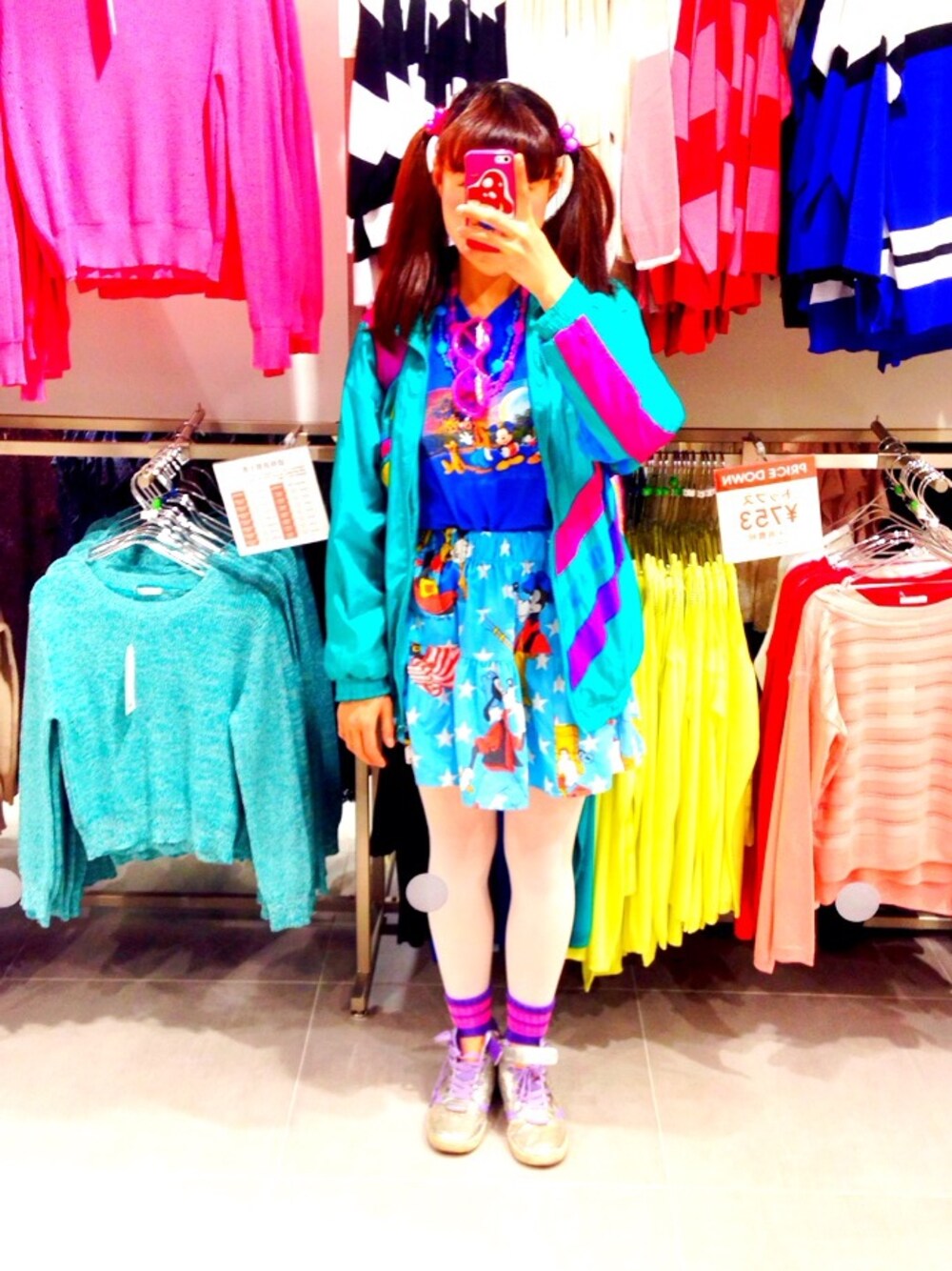最近いつも同じ靴だ😂💗 ミッキーのTシャツ、古着屋さんで購入 上着、古着屋さんで購入 リメイクスカート、古着屋さんで購入 白タイツ、tutuanna 靴、H&Mのkids