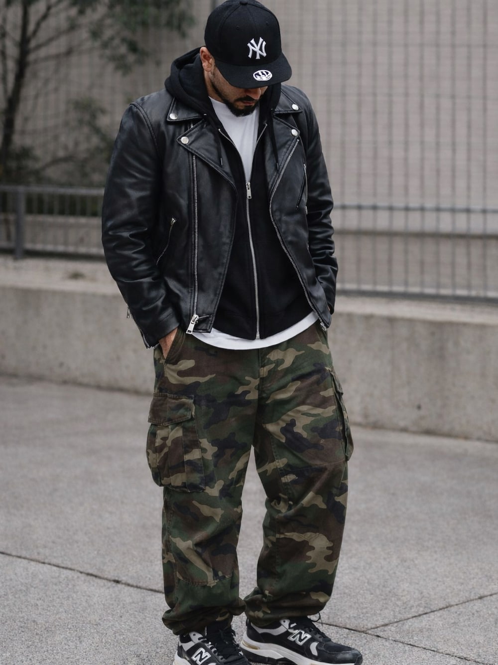 ダブルライダースとカモ柄のカーゴパンツに、ニューエラのキャップとニューバランスの1700でカジュアルさとスポーティさをプラスしてゴリゴリ感を中和。 普段からよくするコーデです。