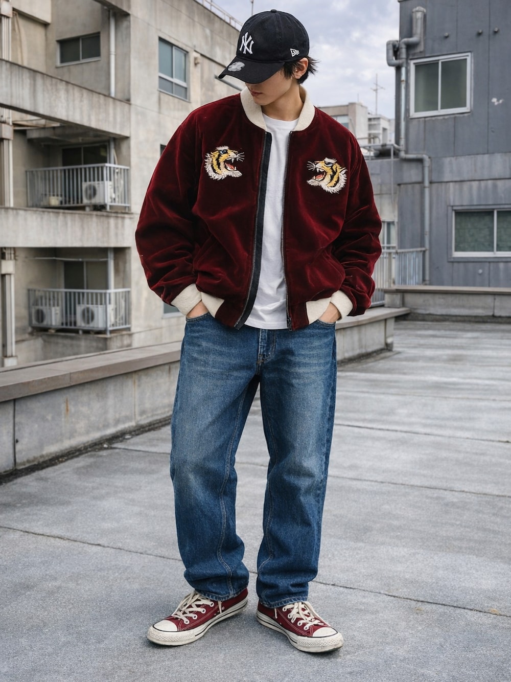 TAIONのダウンスカジャンにリーバイス501を合わせたアメカジコーデ。 スカジャンとCT70の色味と素材感をリンクさせてます。