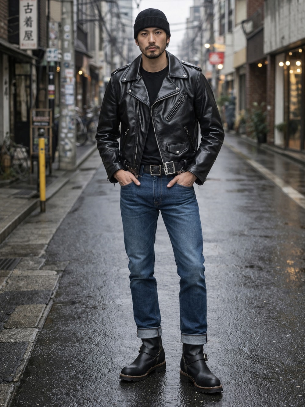 ダブルライダースにデニムパンツ、エンジニアブーツで王道バイカーコーデ