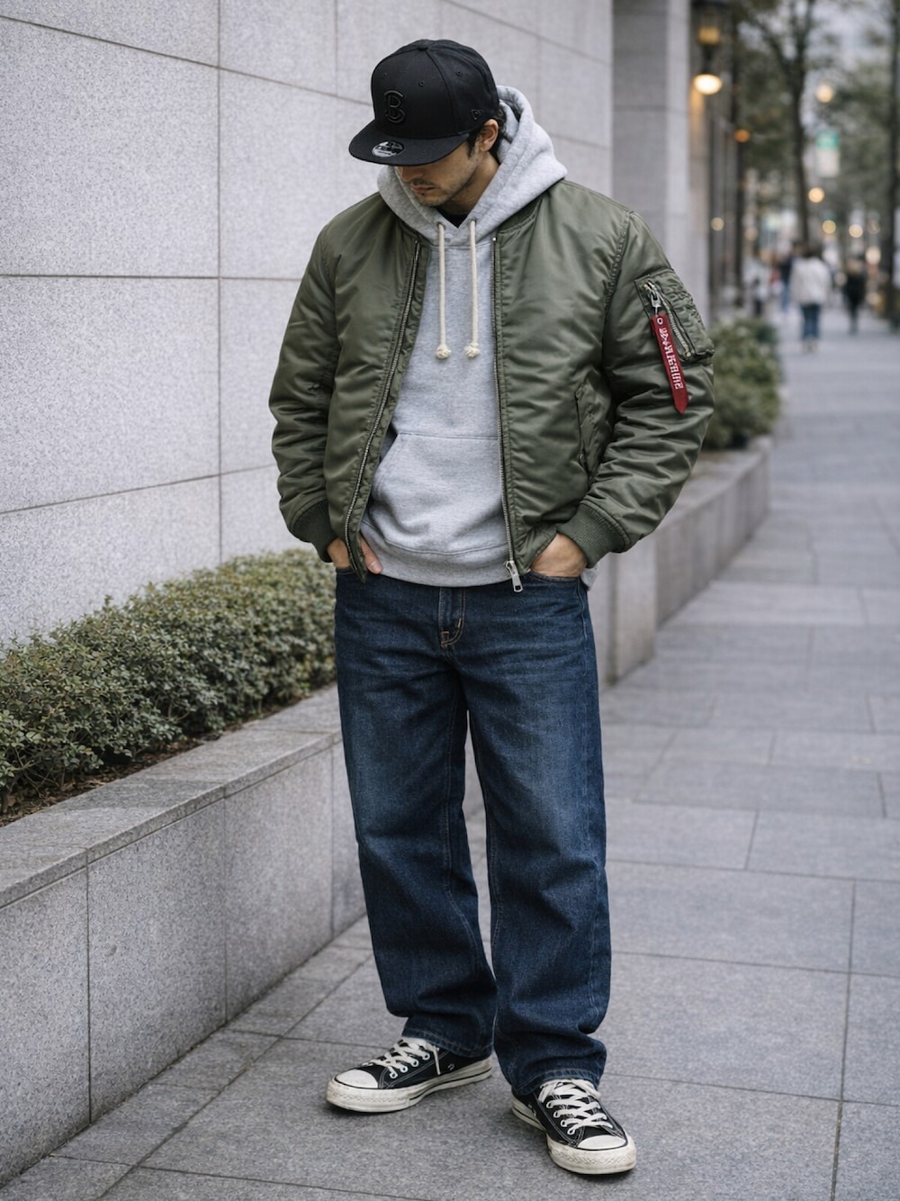 一部でいまだに下火が続く「おじさんは着るな」と某インフルエンサー(笑)が言ったパーカー・MA-1を合わせたアメカジコーデ