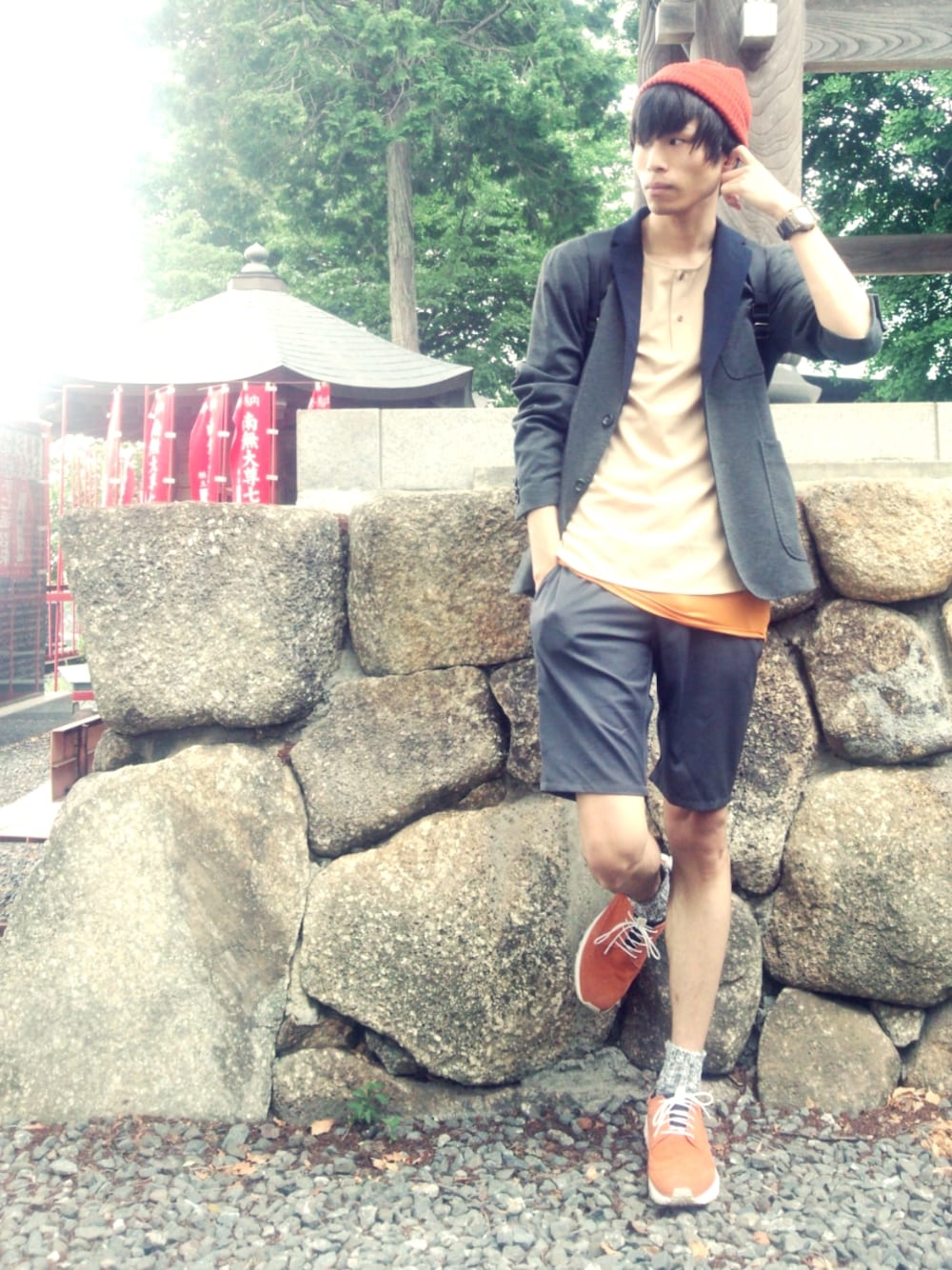 セットアップ風。 オレンジをちりばめました。 ジャケット アダムエロぺ ショーツ フーズフーギャラリー インナー エアリズム 靴下 アーバンリサーチ ニット帽 アダムエロぺ リュック フーズフーギャラリー