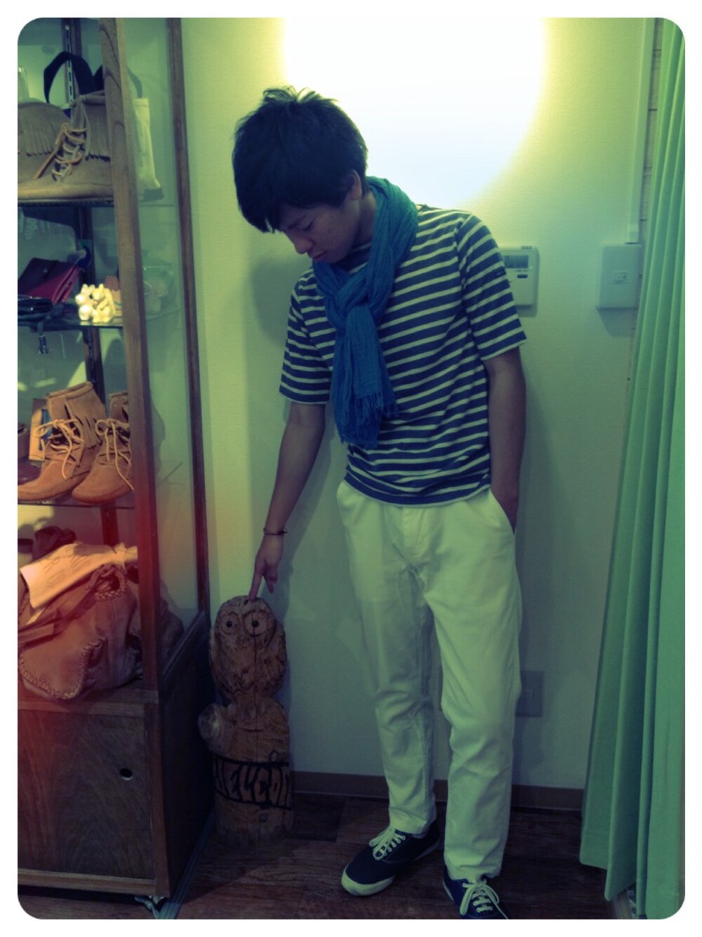 去年のコーデより セントジェームスいいですよね〜^o^ Tシャツパンツだとつまらないので、ストール巻き巻き