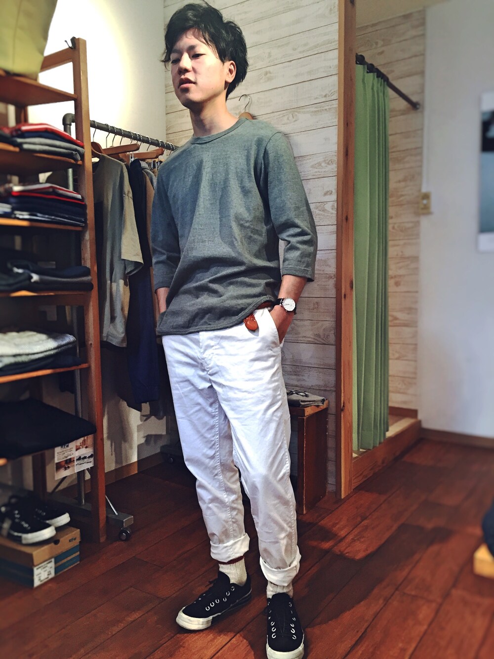 こないだの格好にフィルメランジェ 裾がラウンドカットで見栄えよし。 フィルメランジェ着ると他のTシャツが着れないな〜 素材よし、サイズ感よし。はなまるアイテム